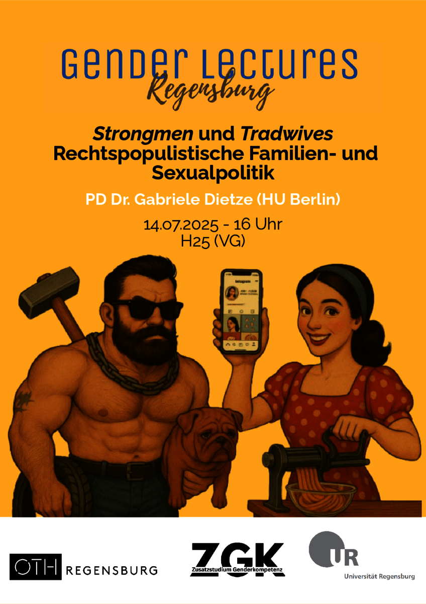 Am 14.7.2025, 16-18 Uhr, sprach PD Dr. Gabriele Dietze, HU Berlin, über Strongmen und Tradwives. Rechtspopulistische Familien- und Sexualpolitik. Der Vortrag fand im H25 (Vielberth-Gebäude) statt.