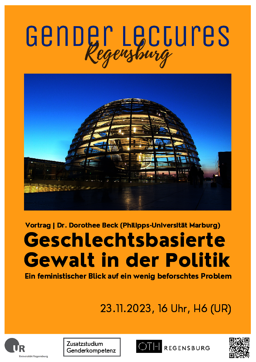 Am 23.11.2023, 16:15 Uhr, H6, eröffnete Dr. Dorothee Beck, Philipps-Universität Marburg, die Vortragsreihe „Gender Lectures Regensburg“. Im Kontext des Internationalen Tags zur Beseitigung von Gewalt gegen Frauen referierte sie zum Thema „Geschlechtsbasierte Gewalt in der Politik – Ein feministischer Blick auf ein wenig beforschtes Problem“.
