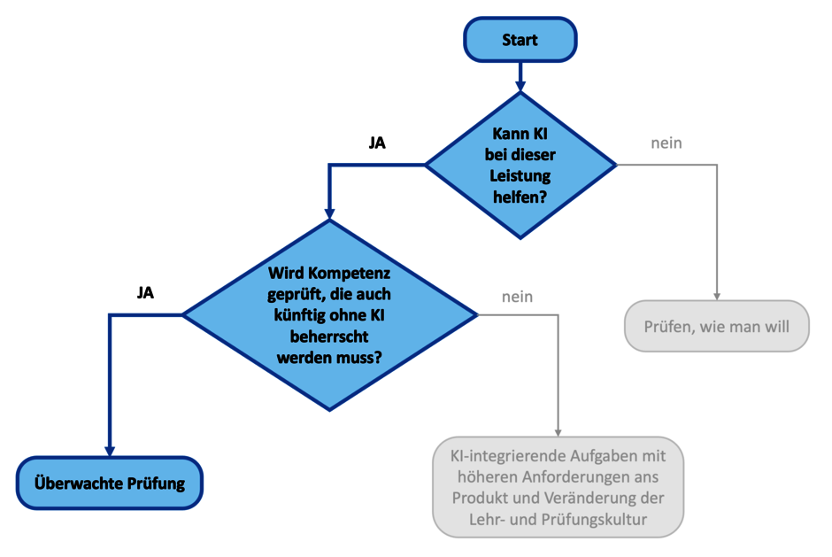 In solchen Fällen empfiehlt sich der Einsatz von überwachten Prüfungsformaten (z. B. schriftliche Klausuren, mündliche Prüfungen). Nur so kann sichergestellt werden, dass die geforderten Kompetenzen eigenständig erbracht und unzulässige KI-Nutzungen ausgeschlossen werden.