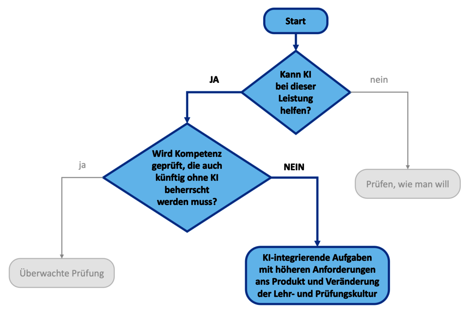 Kann ein bewusster KI-Einsatz den Kompetenzerwerb fördern, sollten Lehrveranstaltung und Prüfungsleistung so gestaltet werden, dass der Einsatz von KI gezielt integriert und reflektiert wird. Daraus folgt, dass die Bewertung der Eigenleistung nicht ausschließlich auf das Endergebnis (z. B. eine Abschlussarbeit) fokussieren sollte, sondern in stärkerem Maße den gesamten Entstehungsprozess berücksichtigen muss.