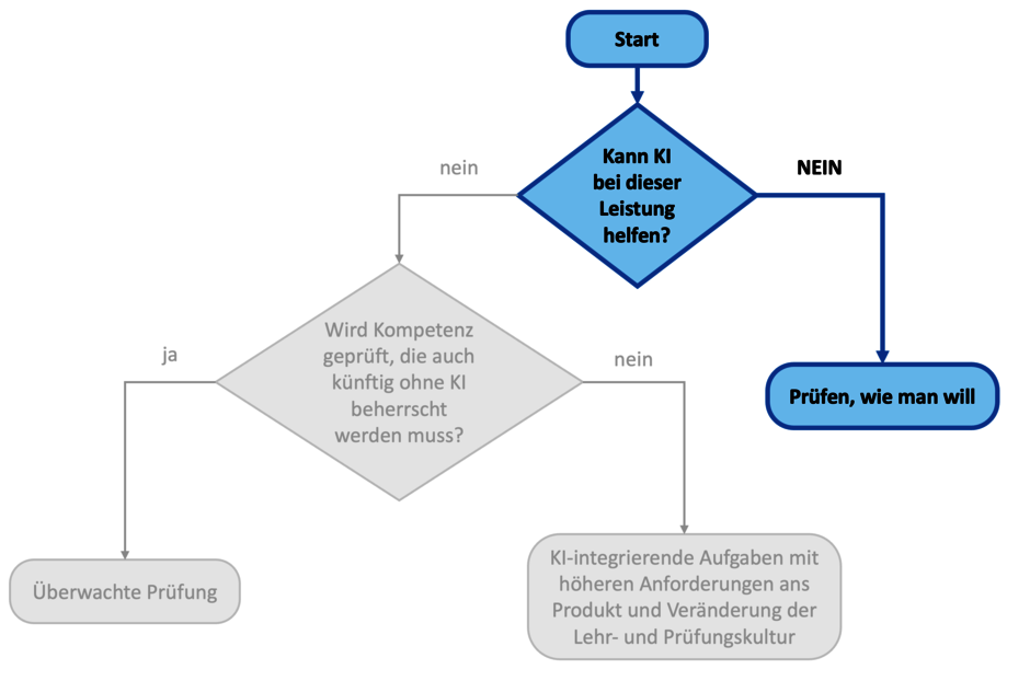 Sofern KI bei der Prüfungsleistung nicht unterstützend eingesetzt werden kann, so ergeben sich keine Auswirkungen auf das Prüfungsformat. Das Prüfungsformat kann dann frei gewählt werden.