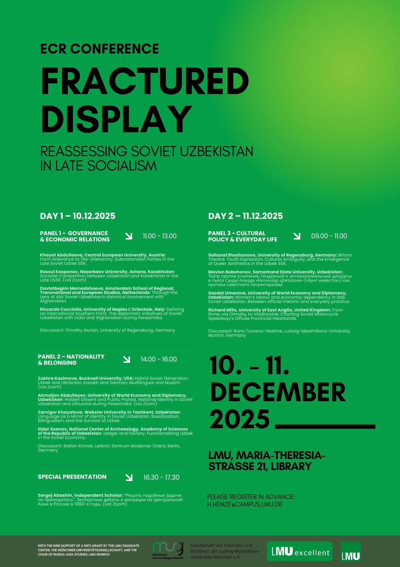 Vom 10. bis 11. Dezember 2025 nahm Prof. Nunan an der Konferenz „Fractured Display – Reassessing Soviet Uzbekistan in Late Socialism” in München teil und leitete als Diskussionsleiter das erste Panel „Governance & Economic Relations”. Die interdisziplinäre Konferenz befasste sich mit den sozialen, politischen und kulturellen Dynamiken des Spätsozialismus in der Usbekischen SSR während der letzten Jahrzehnte der Sowjetunion, einer Republik, die von den sowjetischen Behörden als Beispiel für die harmonische Verschmelzung von sozialistischem Fortschritt und nationaler Kultur angepriesen wurde. Hinter der sorgfältig kuratierten „showcase” des lebendigen usbekischen Erbes, einer florierenden Agrarwirtschaft und der „Modellstadt” Taschkent, der Hauptstadt, verbargen sich jedoch tiefe strukturelle Spannungen und gravierende Widersprüche zwischen offiziellen Narrativen und der gelebten Realität.