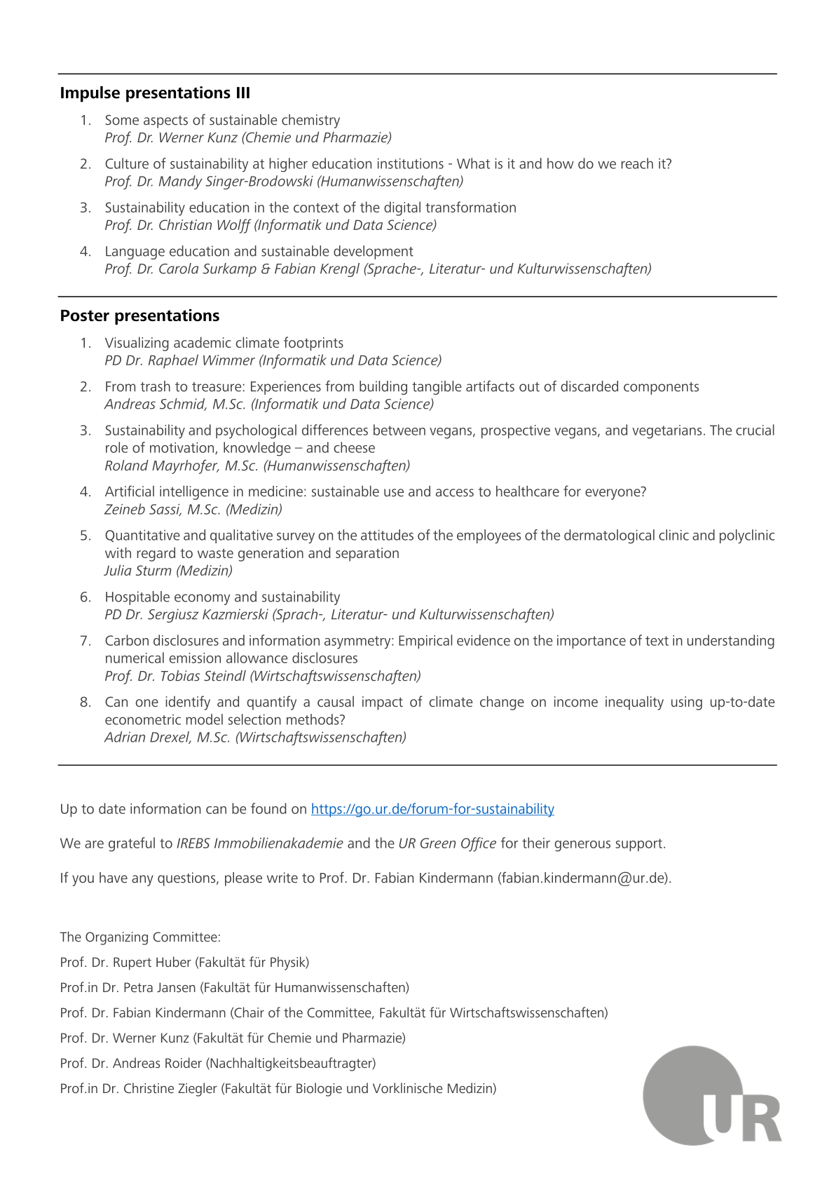 Das Forum stand unter dem Motto „Forschung zu und über Nachhaltigkeit“. Dabei wurde das Thema durch Impulsvorträge aus 11 Fakultäten der UR aus ganz unterschiedlichen Blickwinkeln beleuchtet: über Mikroben, Green Lab-Zertifizierungen, nachhaltiges Finanzieren, Achtsamkeit, Digitalisierung und nachhaltige Chemie bis hin zu der Frage, wie Sprache Transformationsprozesse gestalten kann. Die Veranstaltung zeigte eindrucksvoll die breite Palette an Themen im Bereich Nachhaltigkeit, an denen Wissenschaftlerinnen und Wissenschaftler der Universität Regensburg arbeiten und forschen.