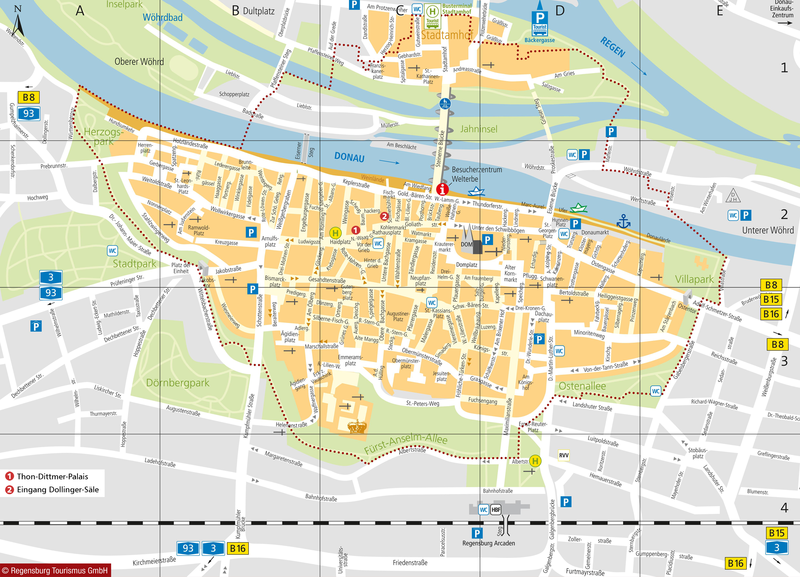 Vom Hauptbahnhof Regensburg aus erreichen Sie das Thon-Dittmer-Palais am Haidplatz am besten direkt mit dem Altstadtbus. Er fährt ab Hbf. / Busbahnhof Albertstr. direkt über Maximilianstr. –Domplatz–Altes Rathaus zum Haidplatz. Nähere Auskünfte finden Sie beim Regensburger Verkehrsverbund, den Fahrplan für die Altstadtbuslinie A finden Sie hier.