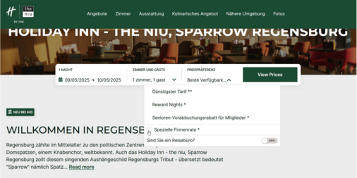 6. Eine Auswahl von verfügbaren Zimmern mit ggf. vergünstigten Preisen wird angezeigt und kann gebucht werden.