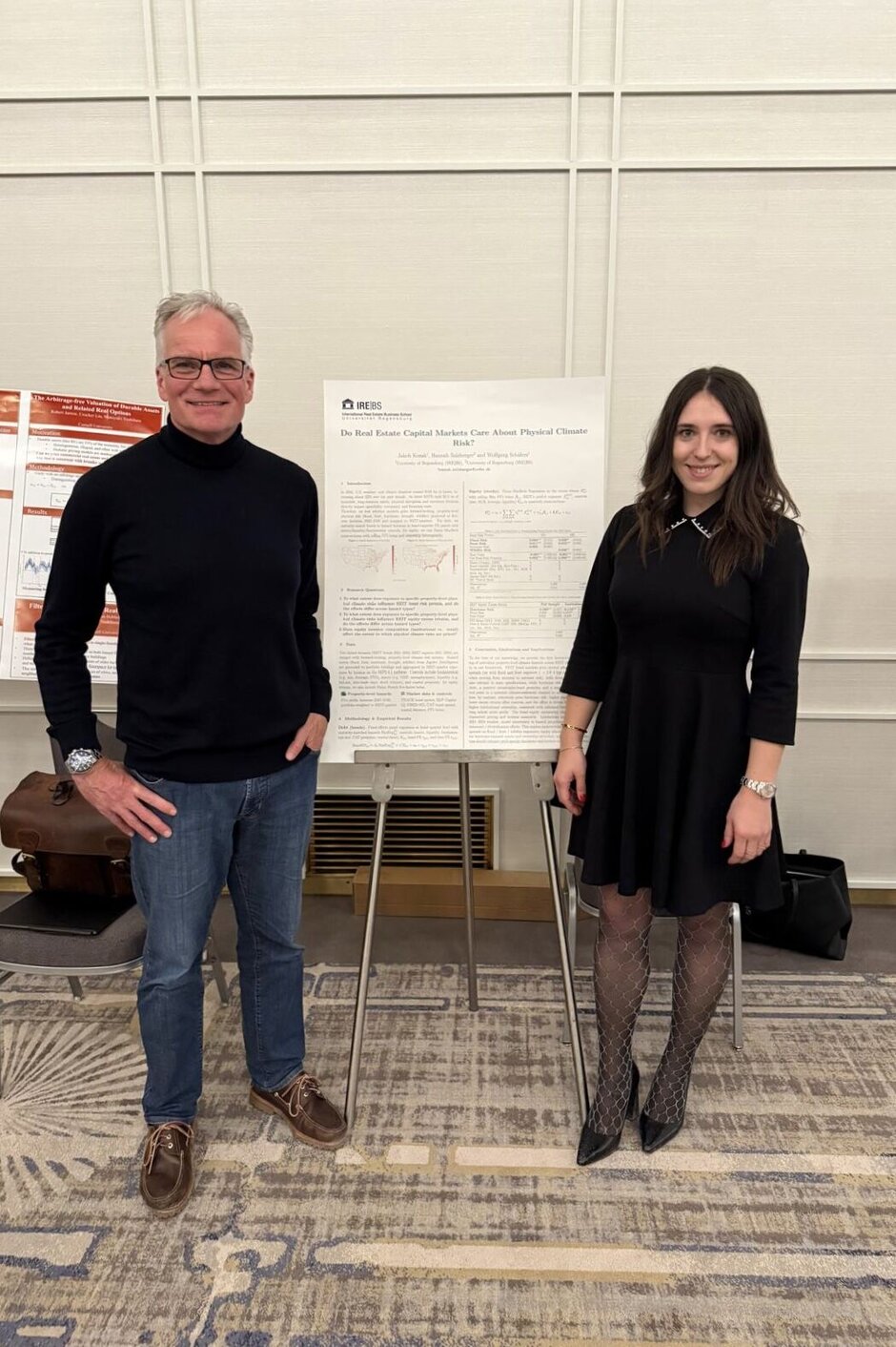 Auf der 𝗔𝗺𝗲𝗿𝗶𝗰𝗮𝗻 𝗥𝗲𝗮𝗹 𝗘𝘀𝘁𝗮𝘁𝗲 𝗮𝗻𝗱 𝗨𝗿𝗯𝗮𝗻 𝗘𝗰𝗼𝗻𝗼𝗺𝗶𝗰𝘀 𝗔𝘀𝘀𝗼𝗰𝗶𝗮𝘁𝗶𝗼𝗻 (𝗔𝗨𝗥𝗘𝗨𝗔) Conference präsentierten IRE|BS-Doktoranden Hannah Salzberger und Jakob Kozak und Wolfgang Schäfers ihr Paper „Do Real Estate Capital Markets Care about Physical Climate Risk?“ in der PhD Poster Session. Die Studie untersucht, wie physische Klimarisiken in der Bepreisung von US-REITs berücksichtigt werden. Das Poster gehörte zu den 15 von über 50 eingereichten Beiträgen, die ausgewählt wurden.