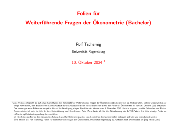 Die Veranstaltung richtet sich an Bachelor-Studierende der 2. Studienphase, die bereits die Veranstaltung Einführung in die Ökonometrie besucht haben.