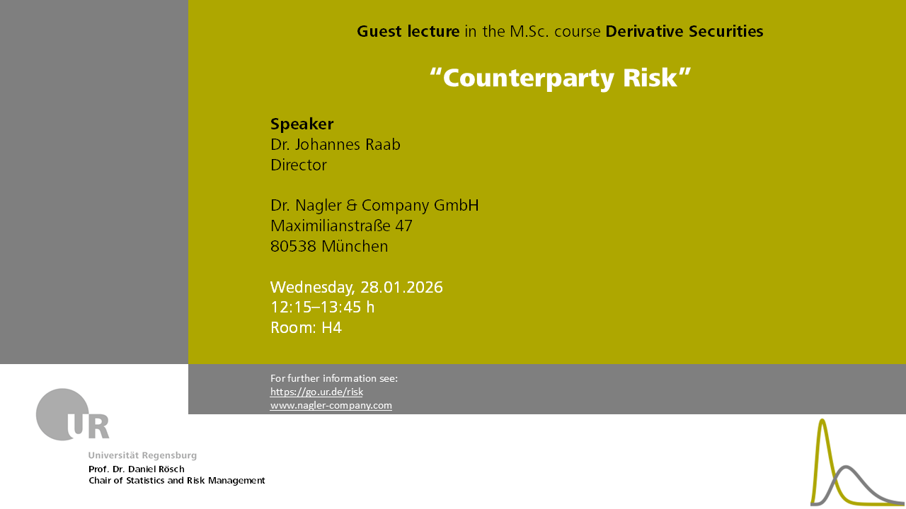 We are delighted to welcome Dr. Johannes Raab from Dr. Nagler & Company GmbH, who will give a guest lecture on "Counterparty Risk" on Wednesday, 28 January 2026, at 12:15 in room H4.