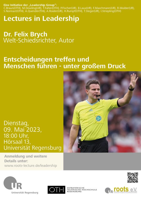Wir freuen uns, Herrn Dr. Felix Brych, Welt-Schiedsrichter, am Dienstag, den 09. Mai 2023 um 18.00 Uhr zur nächsten Veranstaltung in der Reihe "Lectures in Leadership" begrüßen zu dürfen.