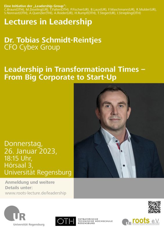 Wir freuen uns, Herrn Dr. Tobias Schmidt-Reintjes, CFO Cybex Group, am Donnerstag, den 26. Januar 2023 um 18.15 Uhr zur nächsten Veranstaltung in der Reihe "Lectures in Leadership" begrüßen zu dürfen.