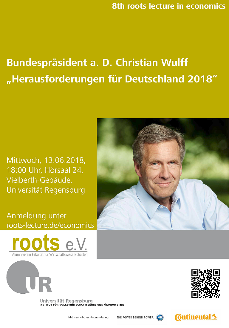 Zur achten „roots lecture in economics“ des Instituts für Volkswirtschaftslehre und Ökonometrie der Universität Regensburg und des Alumnivereins der Fakultät für Wirtschaftswissenschaften roots e.V., begrüßen wir am Mittwoch, den 13. Juni 2018 um 18:00 Uhr im H24 des Vielberth-Gebäudes der Universität Regensburg Herrn Bundespräsidenten a.D. Christian Wulff mit dem Thema