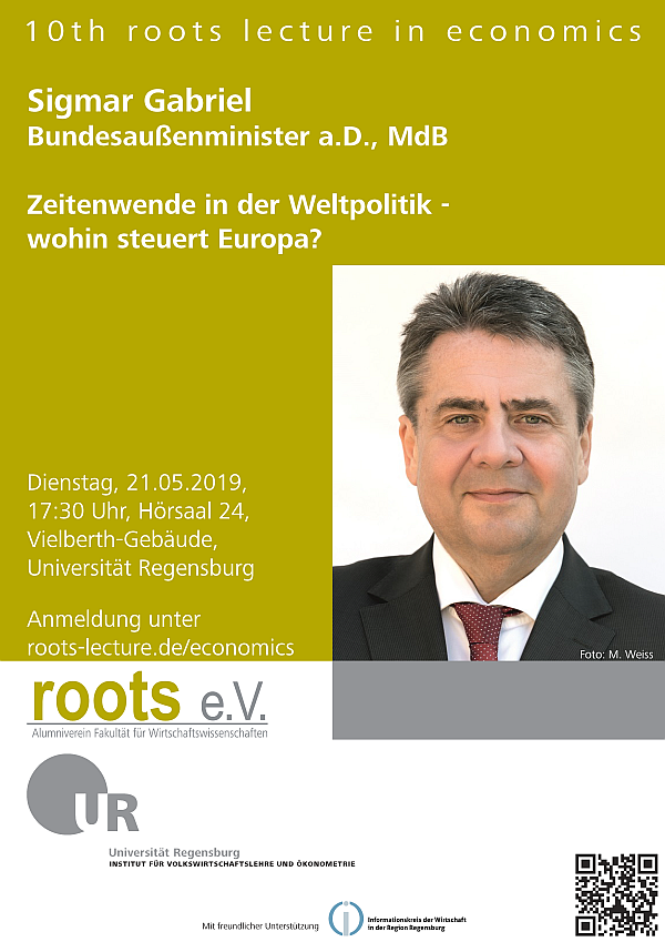 Zur zehnten „roots lecture in economics“ des Instituts für Volkswirtschaftslehre und Ökonometrie der Universität Regensburg und des Alumnivereins der Fakultät für Wirtschaftswissenschaften roots e.V., begrüßen wir am Dienstag, den 21. April 2019 um 17:30 Uhr im Hörsaal 24 des Vielberth-Gebäudes der Universität Regensburg Herrn Sigmar Gabriel, MdB.
