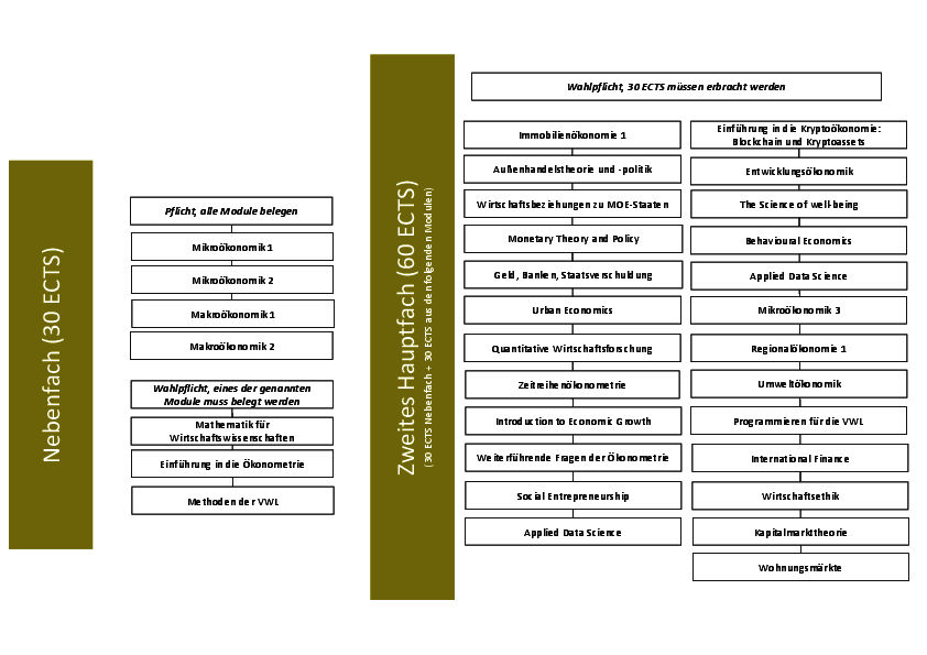 Im Rahmen des Nebenfaches VWL belegen Sie 30 ECTS aus einem Modulangebot der grundständigen VWL-Veranstaltungen. Im Rahmen des zweiten Hauptfaches belegen Sie 60 ECTS. 30 ECTS dieser 60 ECTS werden durch grundständige Veranstaltungen des Nebenfaches abgedeckt. Die verbleibenden 30 ECTS können aus einem Angebot von weiterführenden VWL-Veranstaltungen gewählt werden.