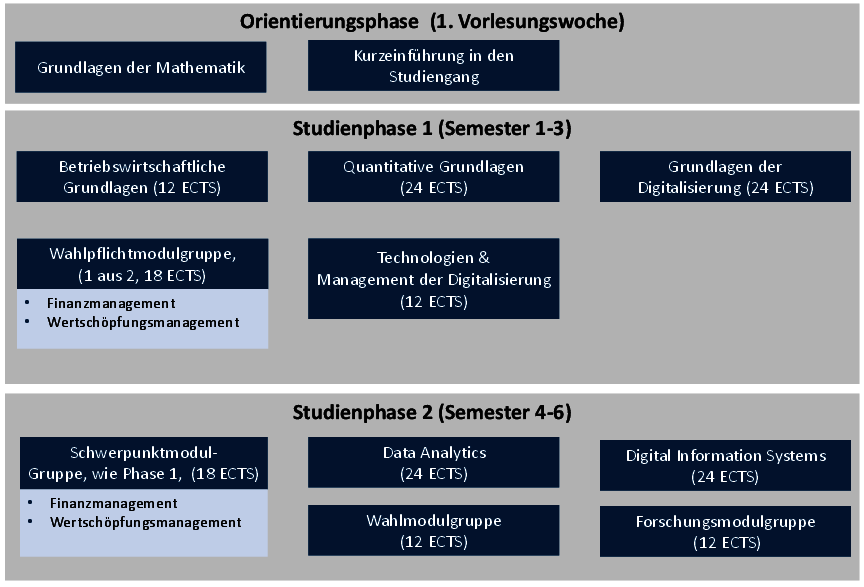 Das Studium des Digital Business im Bachelorstudiengang gliedert sich in zwei Studienphasen, die jeweils drei Semester umfassen.