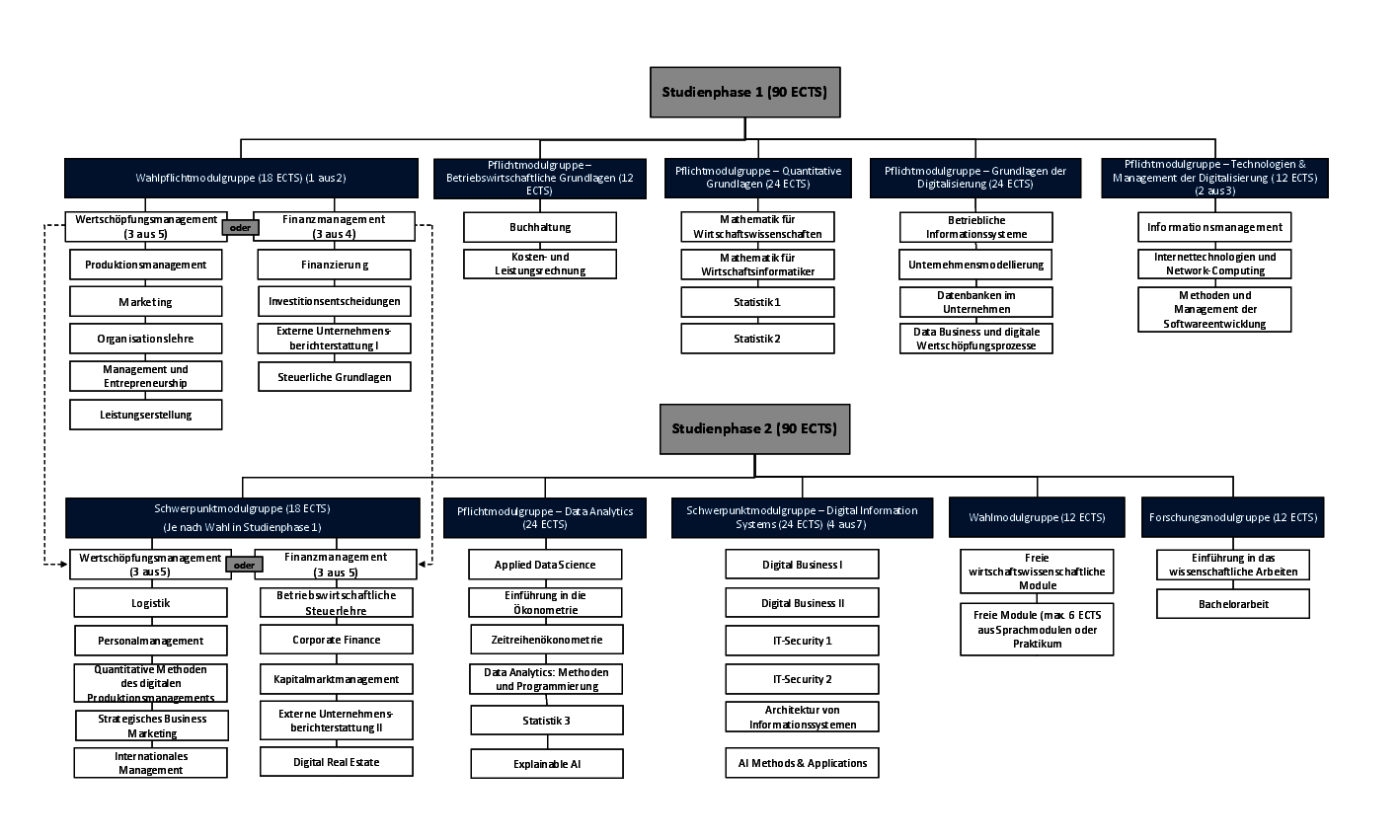- Die zweite Studienphase dient der Vertiefung der Grundlagen und der weiteren Spezialisierung. Der gewähte Schwerpunkt aus der ersten Phase wird in der zweiten Studienphase weiter vertieft. Die fachspezifische Vertiefung wird außerdem durch die Modulgruppen Digital Information Systems und Data Analytics ergänzt.
