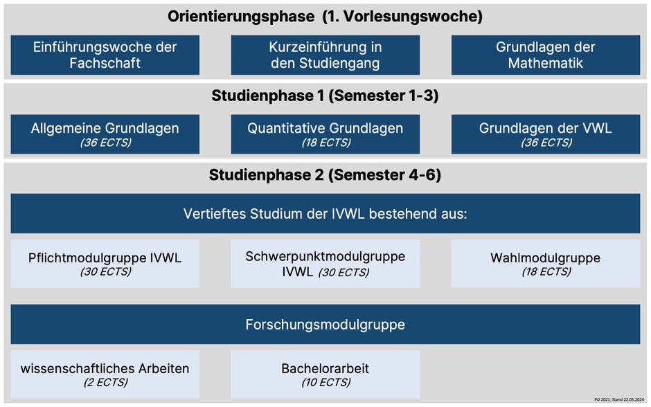 Das Bachelorstudium umfasst 180 Leistungspunkte nach Maßgabe des international üblichen European Credit Transfer Systems (ECTS), kurz 180 "ECTS". Es hat eine Regelstudienzeit von sechs Semestern und ist in zwei Studienphasen zu je 90 ECTS unterteilt.