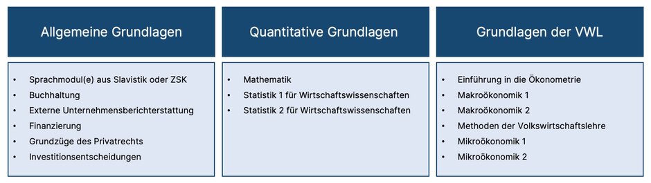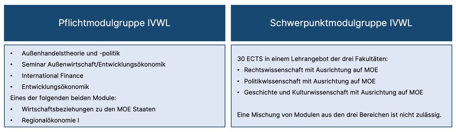 In der zweiten Studienphase erhalten Sie die Gelegenheit, Ihre Kenntnisse der Internationalen Volkswirtschaftslehre in der Pflichtmodulgruppe Internationationale VWL zu vertiefen. Im Gegensatz zu einem klassischen VWL-Studium erarbeiten Sie sich darüber hinaus interdisziplinäre Kenntnisse. In der Schwerpunktmodulgruppe IVWL wählen Sie aus den Bereichen Rechtswissenschaft, Politikwissenschaft oder Geschichte und Kulturwissenschaft und spezialisieren sich innerhalb dieser Bereiche jeweils auf Aspekte des mittel- und osteuropäischen Raums. Die Wahlmodulgruppe gibt Ihnen Gelegenheit, Ihr Wissen um andere Bereiche der VWL oder um Nicht-VWL-Fächer zu erweitern. Sie schließen das Studium mit der Forschungsmodulgruppe (12 ECTS) ab, in der Sie Ihre Bachelorarbeit ablegen.