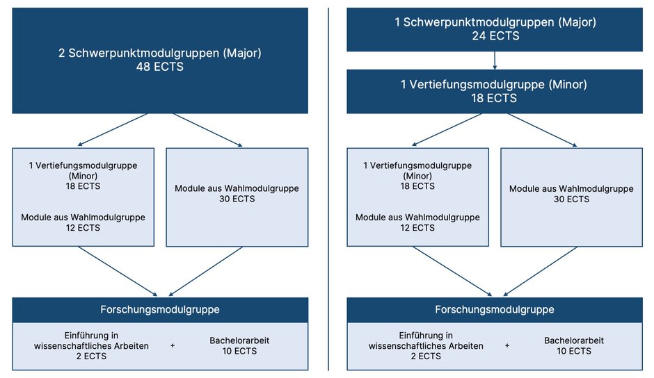 - Zwei Schwerpunktmodulgruppen und eine Vertiefungsmodulgruppe (Wahlmodulgruppe = 12 ECTS)