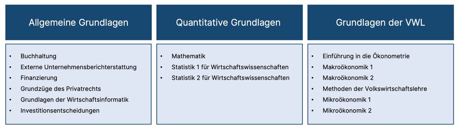 In der ersten Studienphase beginnen Sie mit den einführenden VWL-Kursen in Mikro- und Makroökonomik. Daneben erlernen Sie methodische Grundlagen in den Bereichen Mathematik, Statistik und Ökonometrie sowie allgemeine Grundlagen der Betriebswirtschaftslehre.