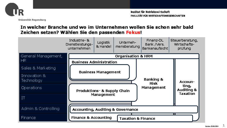 - Einbringen als ein weiteres Modul aus dem Themenbereich einer Schwerpunktmodulgruppe. In vielen BWL Schwerpunktmodulgruppen ist es möglich ein weiteres Modul einzubringen, das aus dem Themenbereich der Schwerpunktmodulgruppe kommt, aber für das es keine äquivalentes Modul an der Universität Regensburg gibt. Dies erfordert die Bescheinigung, dass das Modul aus dem Themenbereich kommt durch den Modulgruppenverantwortlichen.