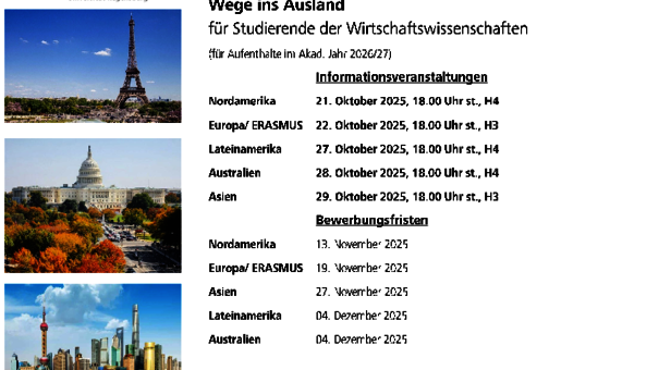 Weitere Informationen zu den verschiedenen Wegen ins Ausland, Austauschprogrammen und Förderungsmöglichkeiten finden Sie auf der Seite des International Office.