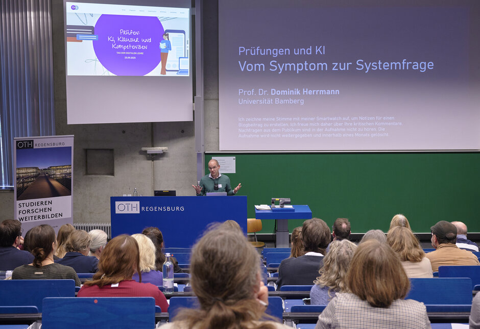 Unter dem Motto “Prüfen: KI, Klausur und Kompetenzen” luden deshalb am 25. September 2025 die OTH Regensburg und die Universität Regensburg ein, sich zu diesem Thema auszutauschen. Rund 100 Lehrende und Interessierte aus ganz Deutschland folgten der Einladung. Der Tag der digitalen Lehre 2025 fand in die Räumlichkeiten der Fakultät Maschinenbau an der OTH Regensburg statt.