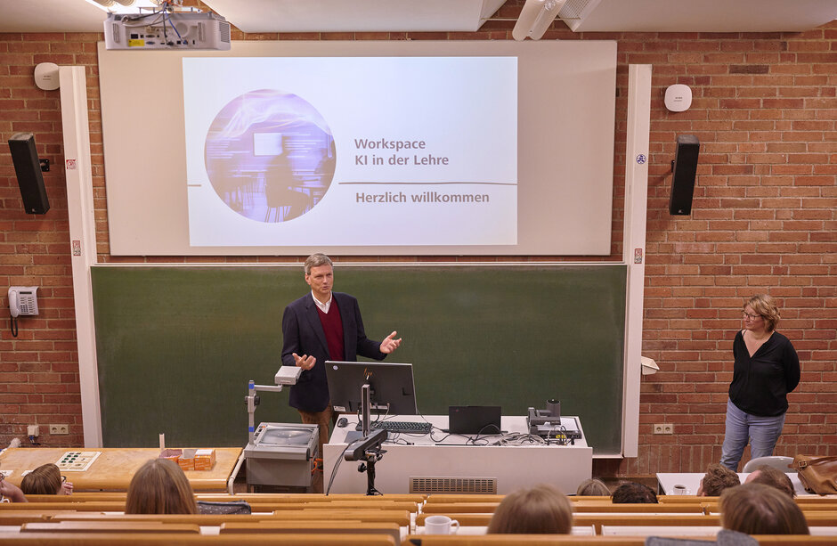 Am 9. April fand an der Universität Regensburg ein fakultätsübergreifender Austausch zum Thema KI in der Hochschullehre statt. Zahlreiche Interessierte trafen sich, um sich über Einsatzmöglichkeiten und Herausforderungen auszutauschen. Eröffnet wurde die Veranstaltung von Prof. Nikolaus Korber, Vizepräsident für Studium, Lehre und Weiterbildung. Im Anschluss diskutierten die Teilnehmenden in thematisch fokussierten Sessions über den Umgang mit KI in Prüfungen, bei schriftlichen Arbeiten sowie über Fragen zu Kompetenzerwerb und ethischen Aspekten.